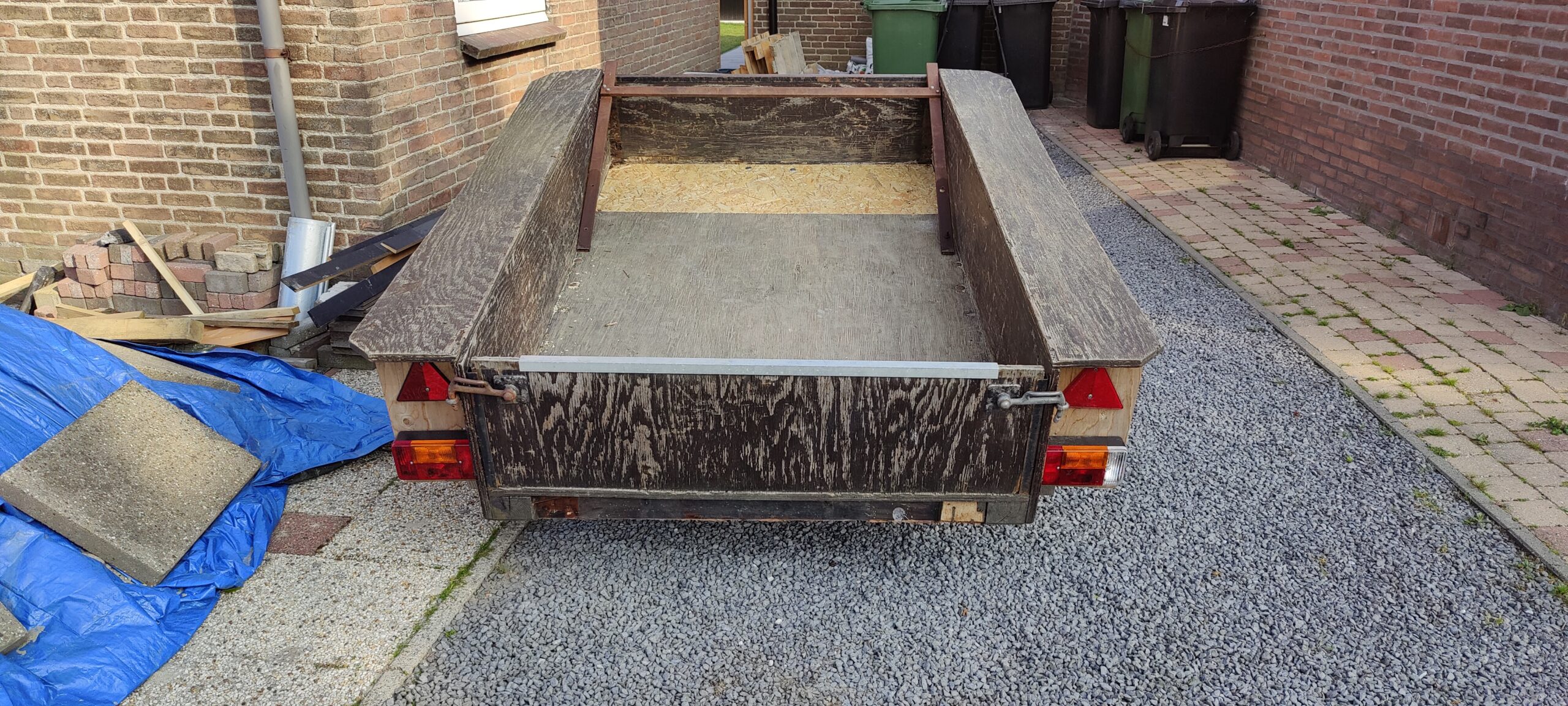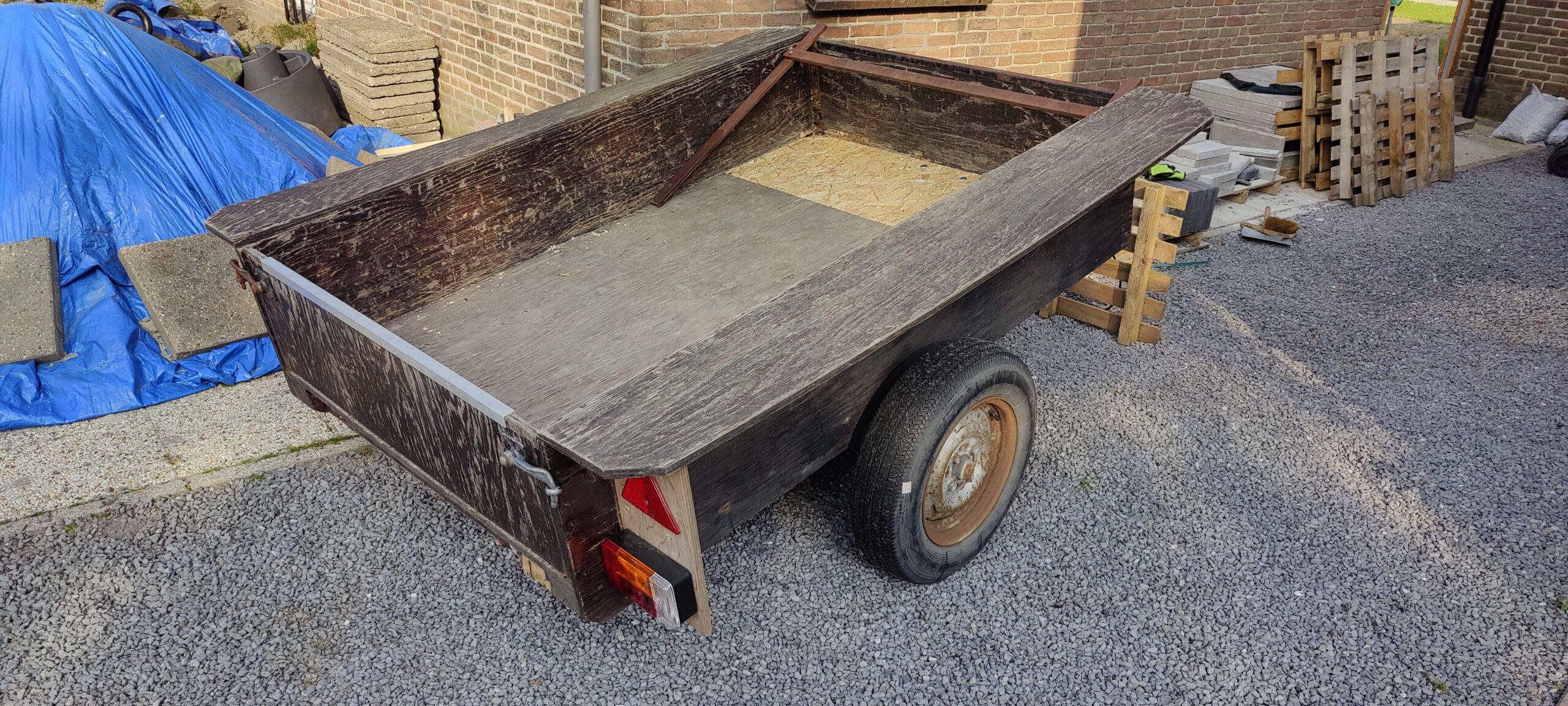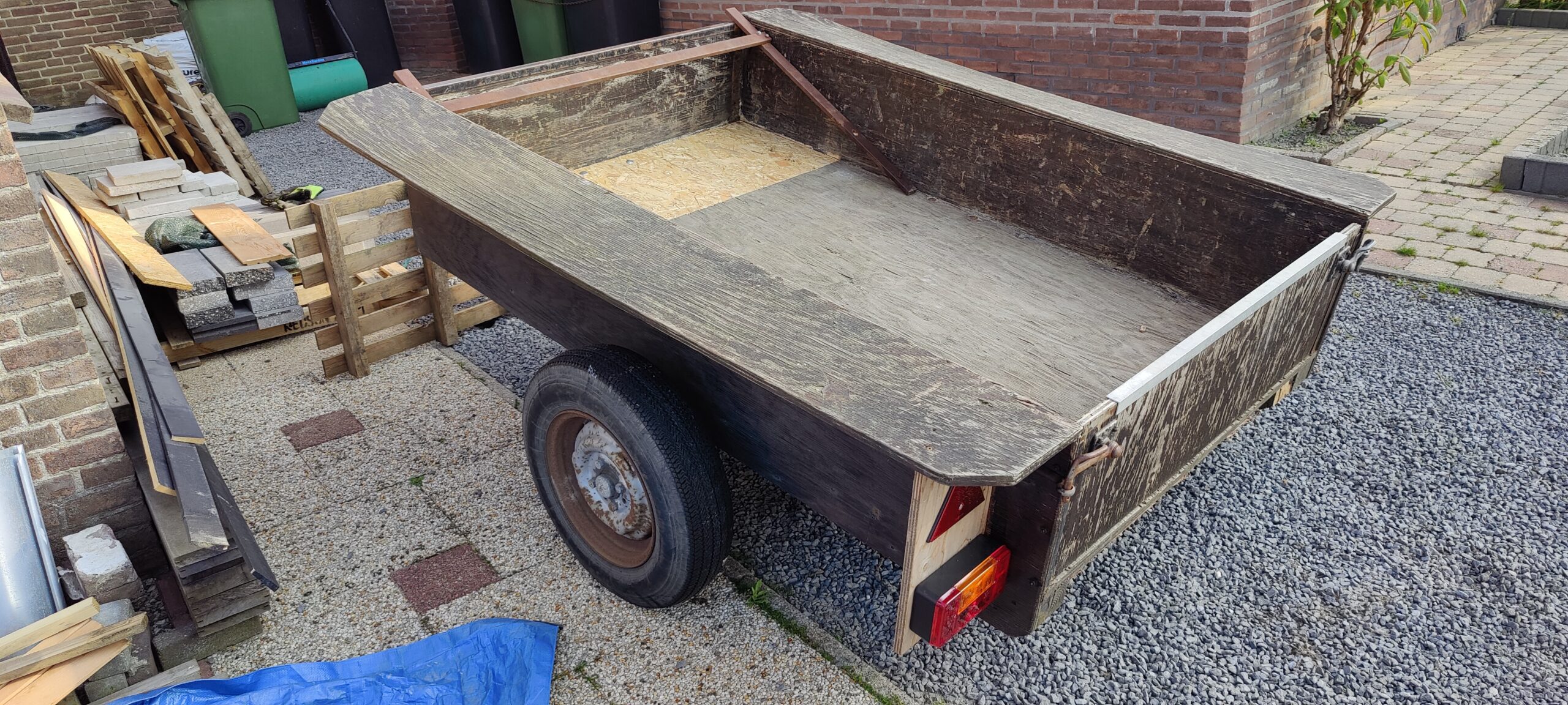 Houten aanhanger. Vorig jaar verlichting en bekabeling vervangen. Met 13 polige stekker.